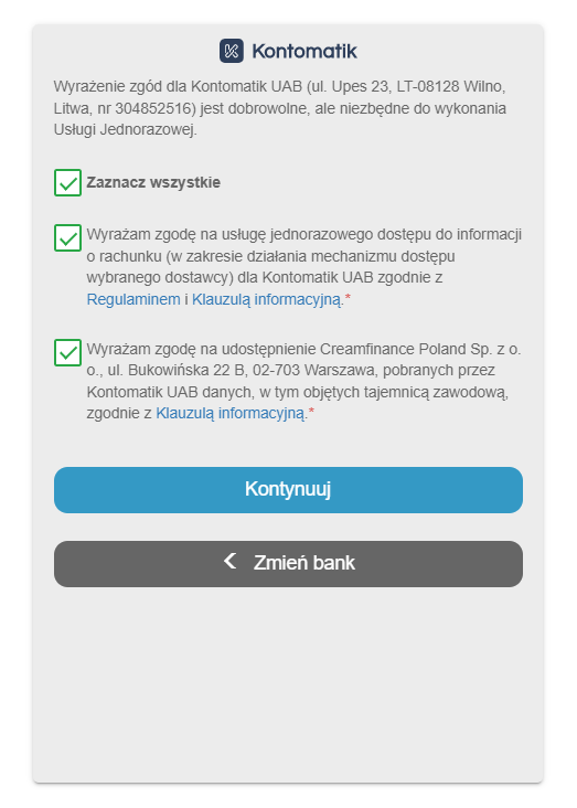Jeżeli Twój bank nie znajduje się na liście obsługiwanych banków, skorzystaj z drugiej opcji, dostępnej pod okienkiem Kontomatik: